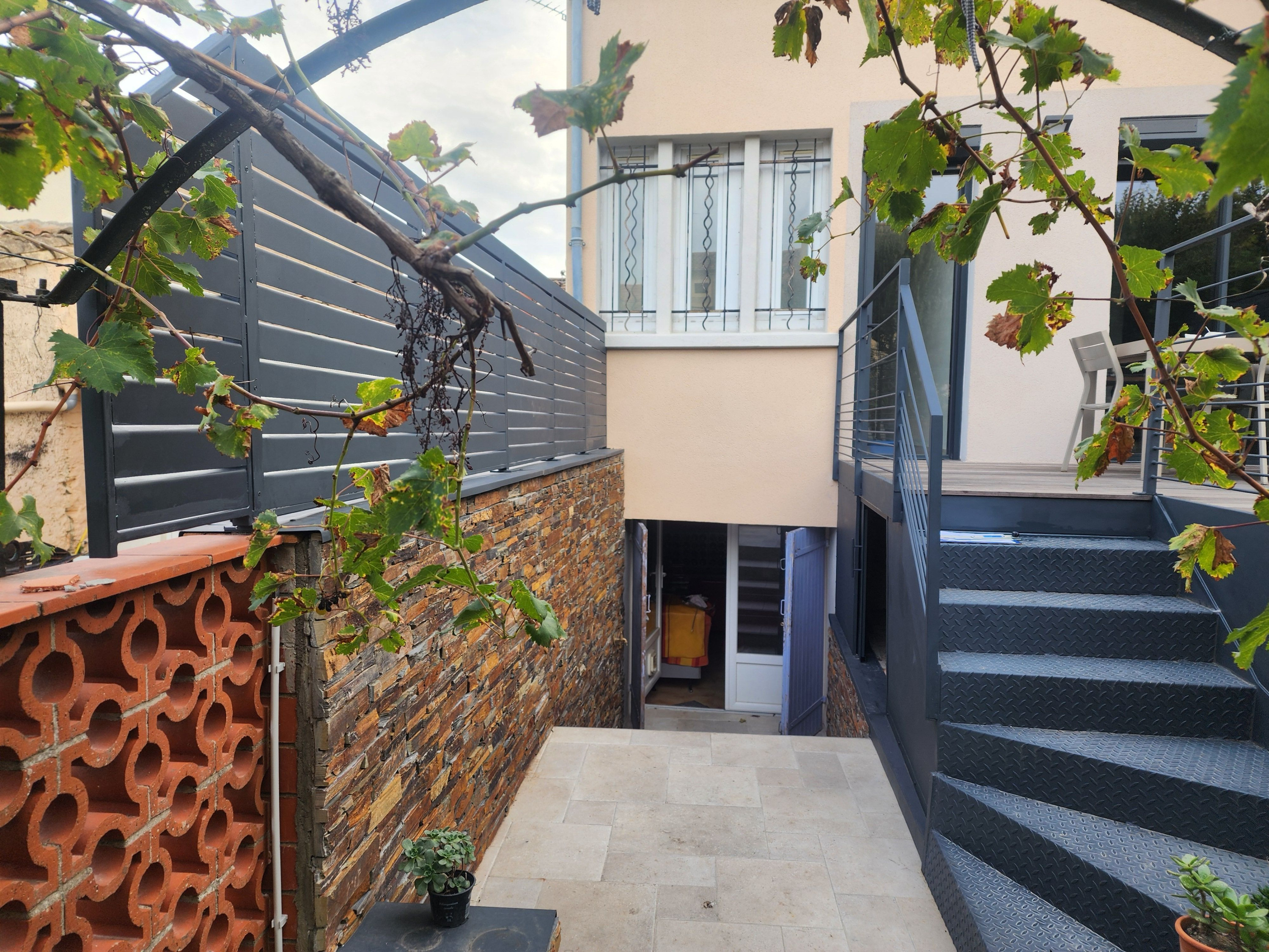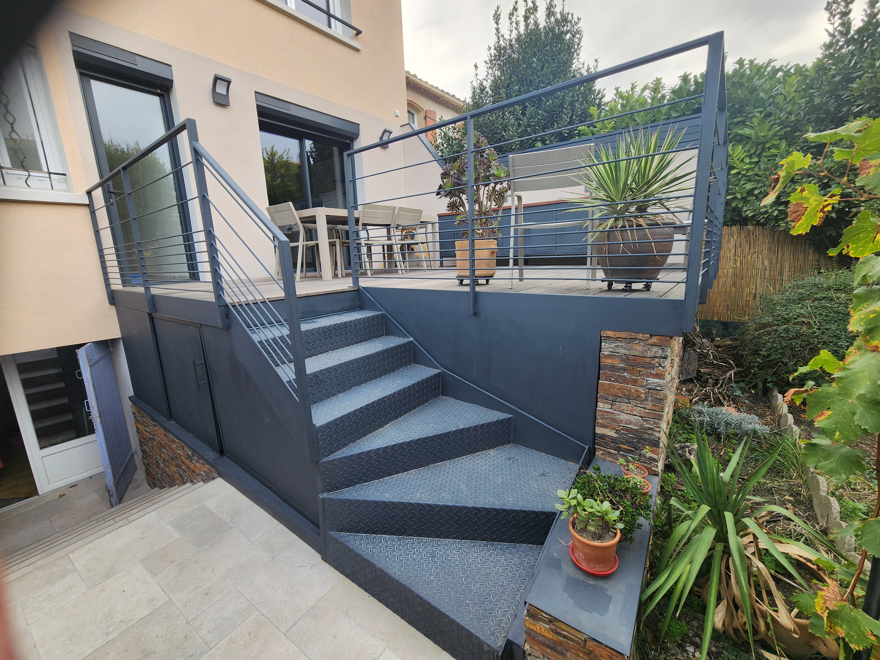 Création d un terrasse extérieure moderne avec garde corps, escalier, Meuble et sol